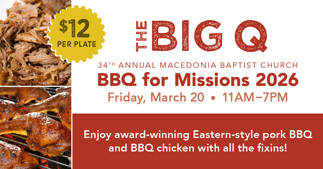 Join us for the 34th annual BBQ for Missions on March 20th from 11 AM until 7 PM. You can eat in, drive through, or take out for some of the best eastern-style pork BBQ and BBQ chicken that you'll find anywhere.